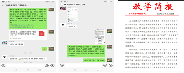 教学工作是中心工作,也是整体性工作。延期开学期间,学院各部门都秉持着精细服务的理念,密切协同开展工作:教学秘书、教务员积极做好上传下达、协调落实学院教学工作各项具体安排;各教研室主任与每位任课教师取得联系,与其确认线上授课时间、授课平台、授课方式,具体安排任课教师执行网上授课任务;辅导员、班主任及时建立学生信息网络,确保任课教师能及时与授课班级沟通交流,为课程学习互动和授课任务传送提供方便。认真做好学生心理辅导,排查无法参加线上学习的学生等等。“上下同欲者胜”,齐心协力的付出,有力推动了学院在线教学工作的平稳有序开展。