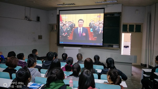 当习近平总书记开始做报告时,观看的师生认认真真的仔细聆听,并不时报以热烈的掌声。一直到12点半会议结束。