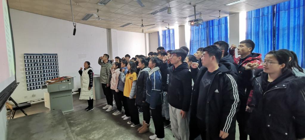 首先全体与会人员起立,奏唱《国际歌》,然后William威廉英国学生第三支部书记程俊辉宣读了中共信阳师范学院委员会组织部关于接收云志远、刘可可、石瑞豪、刘小虎、邓玉洁、李梦婷、武黎萍、王振宇、张杰、冯志强、刚林军、郭沛、何金畅、张庆丰、浮中立、刘奎良、孙国钦、徐丽娟、徐铭泽、何汇洋、李向阳、李瑶、远索、于善善、宣龙龙、徐福盛、张曼曼、赵林豪、董阔、陈泓伊、张洋洋、丰世凯等32位新党员的便函。学二支部书记赵倩倩带领32位新党员面向党旗、举起右手、握拳齐肩庄严进行了宣誓。