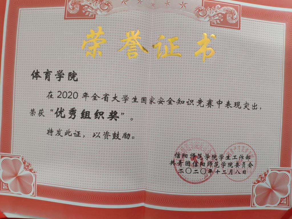 为深入贯彻习近平总书记关于总体国家安全观的重要论述,全面落实中央、省委关于加强国家安全教育有关通知精神和“将国家安全教育纳入国民教育体系”的法定要求,提高青年大学生的国家安全意识,我院严格落实校相关文件要求于10月9日至11月15日期间举办了大学生国家安全知识竞赛活动。竞赛活动得到了我院全体师生的高度重视和积极参与,各年级辅导员、班委广泛宣传、精心组织,参赛选手扎实准备、认真答题,在全院范围内形成了良好的学习氛围。,我院获得优秀组织单位,程俊辉为优秀指导教师。