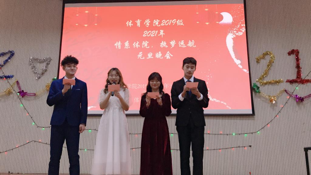 元旦将至,为庆祝元旦佳节,进一步推进系文艺活动的蓬勃发展,丰富校园文化生活,活跃学习氛围,给同学们一个真正展示自我风采和勇气的舞台。我院于2020年12月25日晚七点于人文楼报告厅举办“2019级元旦晚会”,本次晚会由19级学生自主筹办,由副处级辅导员柴九昌老师,团委老师程俊辉老师,19级辅导员赖梦玥老师,20级辅导员龙慧杰老师出席,19级全体学生参加。