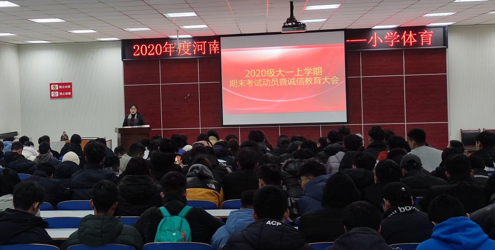 为加强我院学风建设,严肃考风考纪,营造良好的学习氛围,2020级期末考试动员大会暨诚信教育大会于2021年1月5日上午12点在体育馆多媒体教室召开。本次会议由我院20级辅导员龙慧杰主持召开,2020级全体学生参与会议。