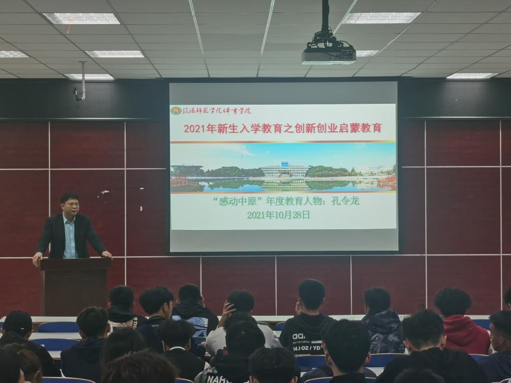 10月28日晚上7:00,我院在体育馆多媒体教师举行2021年新生入学教育之创新创业启蒙教育,本次讲座由“感动中原”年度教育人物孔令龙主讲,21级全体同学参加,活动由院党委副书记柴九昌主持。