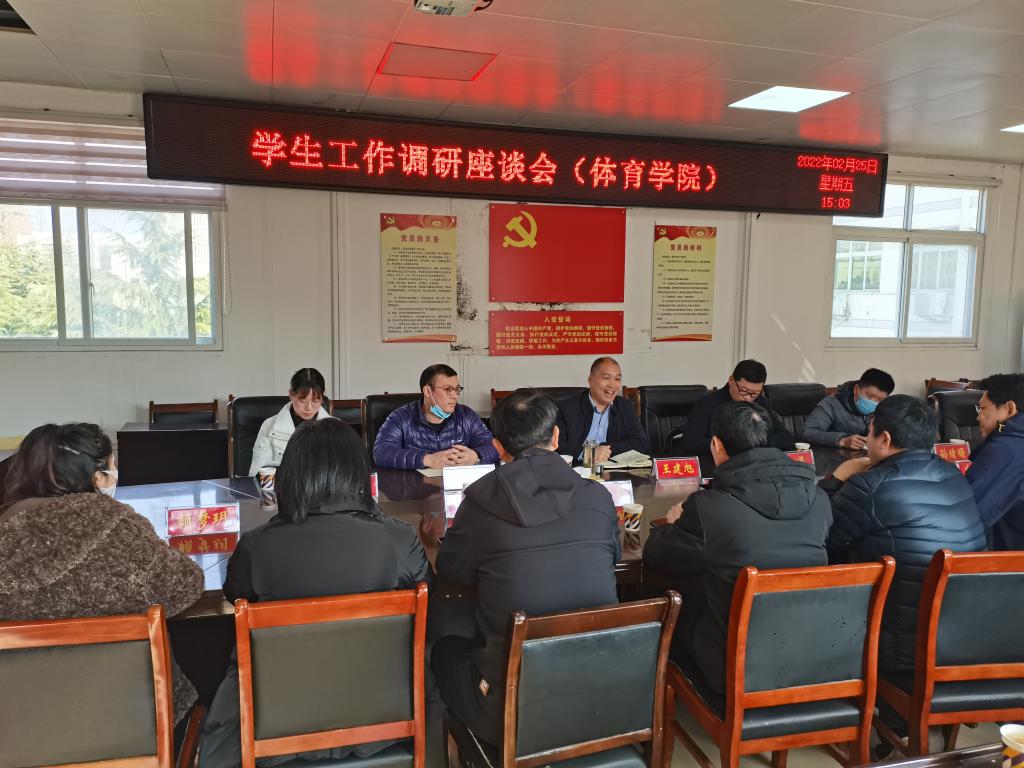 2月25日,学生处处长王建旭,副处长雷梁,国防科科长陈颢文、管理科科长孙绪曙莅临我院调研学生工作。William威廉英国党委书记张晓峰,院长余道明,副书记柴九昌,副院长牛林杰、张翔、张娟、杨晶伟与王建旭处长一行在三楼会议室进行了座谈。参加座谈的还有我院行管人员及全体辅导员。座谈会由张晓峰主持。