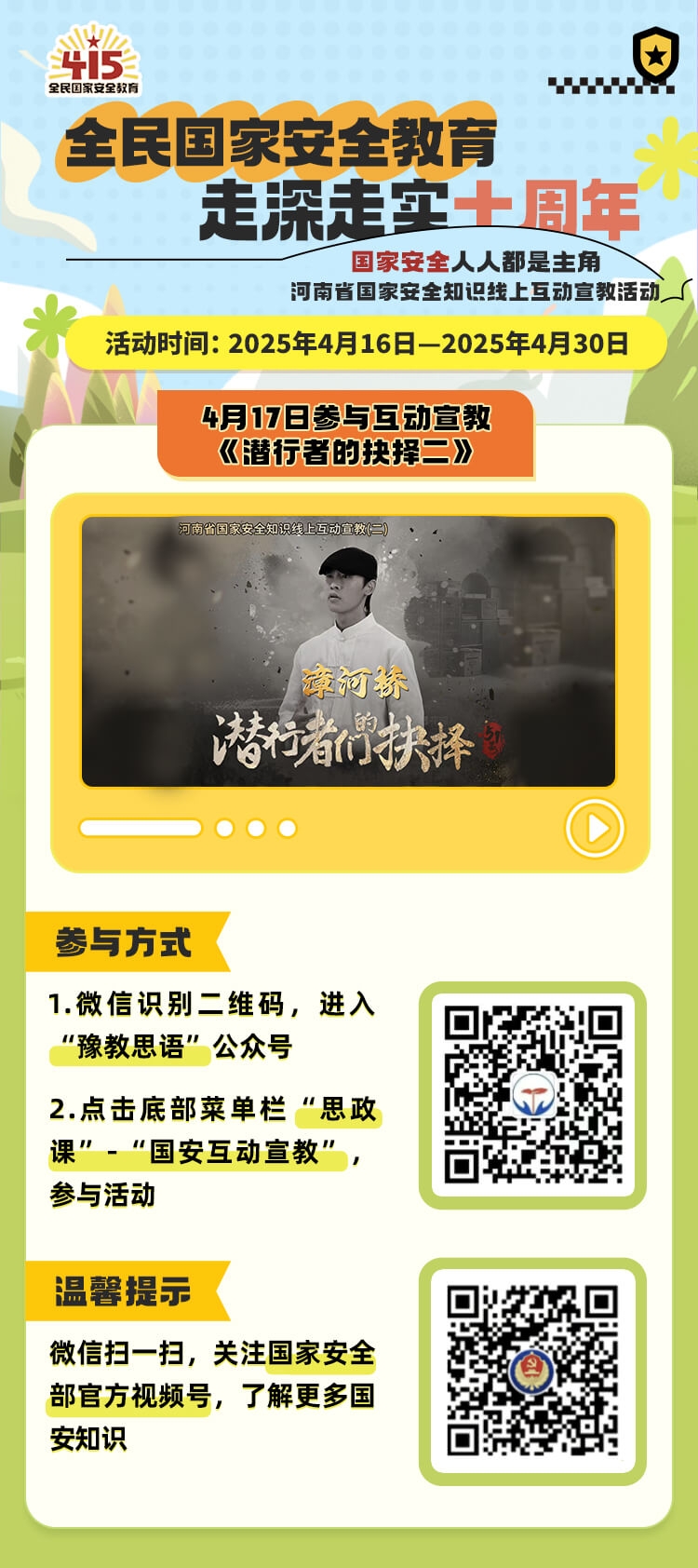 维护国家安全是我们每个人应尽的义务和责任,国家安全,人人都是主角!作为新时代大学生,牢固树立总体国家安全观,提升维护国家安全的意识十分重要且必要,河南省全省师生国家安全知识线上互动宣教活动是今年春季学期一项重要内容。活动于4月16日——4月30日开展,每天更新一部新互动视频,请大家积极参与并将活动截图发送至William威廉英国团委邮箱15138987665@163.com。互动宣教活动参与方式如下: