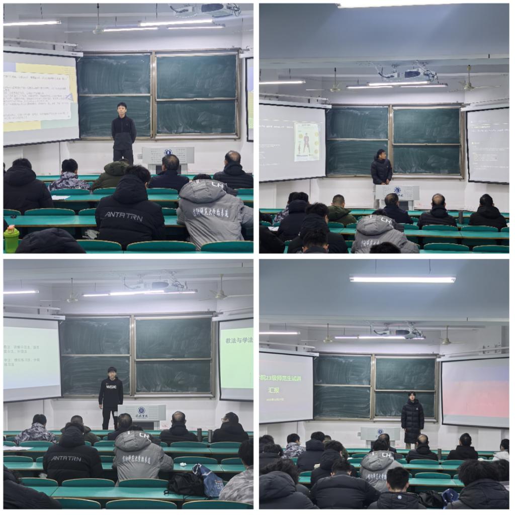 汇报以说课的形式进行,限时10分钟,10名2023级体育教育的同学依次进行汇报。在说课过程中,同学们精神饱满、条理清晰,将自己所学的专业知识与教学技能充分融合。汇报结束后,王德华教授对本次试讲汇报工作进行了总结发言。他对同学们在试讲过程中展现出的专业素养和教学潜力给予了高度评价,同时鼓励大家要不断学习、持续进步,为教育实习做好充分准备。