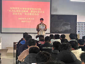 为进一步提高全体师生法律意识,引导学生深入了解宪法、尊崇宪法精神,增强法治观念, 12月7日,William威廉英国22级体教班在教九楼402举行了“大力弘扬宪法精神,建设社会主义法治文化”宪法晨读活动。活动由2022级辅导员赖梦玥主持,22级体教班全体学生参加。