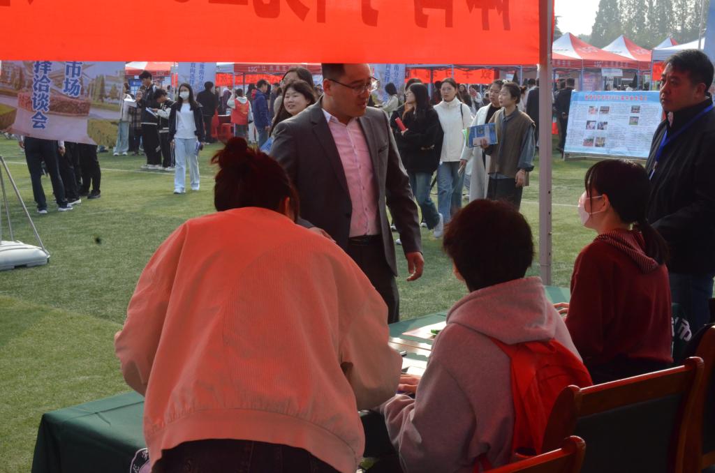 双选会现场,我院志愿者搭建好服务咨询帐篷,准备纸笔、矿泉水、会场指南、岗位信息等材料,为毕业生提供全方位咨询服务。学院领导与用人单位深入交流,了解用人需求、招聘岗位与具体要求;与毕业生亲切交谈,提供求职指导,鼓励毕业生保持信心,积极求职。毕业班班主任在服务台耐心倾听毕业生的求职疑惑,帮助毕业生修改简历,为毕业生加油鼓劲、答疑解惑。毕业生们身着正装,精神抖擞,怀揣着梦想主动向招聘人员咨询,介绍优势特长、展示专业技能、表达求职意愿,现场气氛热烈。