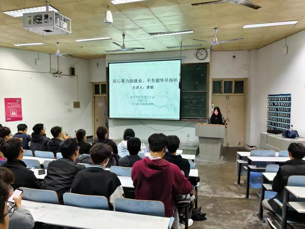 唐娟结合体育专业特性,从“职业认知、规划策略、就业实践”三方面展开讲解。她指出,体育专业学生可在体育教育、健身指导、赛事运营等领域深耕,需提前明确自身定位,“要把专业技能转化为职业优势,比如体育教育方向需夯实教学能力,健身行业则要注重证书考取与实操经验积累。”针对学生关注的就业困惑,唐娟通过案例分析引导大家规避求职误区,以往届优秀毕业生为例,强调实习经历与职业规划的关联性。互动环节中,学生们就“跨行业就业可行性”、“考公与企业求职如何抉择”等问题踊跃提问,氛围热烈。