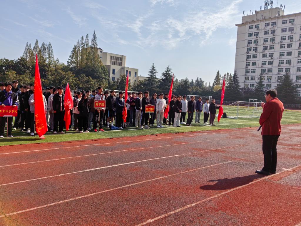 入场仪式后,全体人员肃立,奏唱中华人民共和国国歌。庄重的旋律进一步凝聚了现场人员的集体荣誉感。柴九昌在致辞中对赛事开幕表示祝贺,向赛事筹备工作人员及参赛队伍致以问候。他表示,学校高度重视体育育人工作,“迎新杯”足球赛是校园体育品牌活动,既是传承体育精神的平台,也是帮助新生融入校园的重要途径。他要求全体参赛队员遵守比赛规则,秉持“友谊第一、比赛第二”原则,赛出风格与水平;希望裁判员公正执裁,工作人员履职尽责,共同保障赛事顺利开展。随后,运动员代表与裁判员代表先后宣誓。